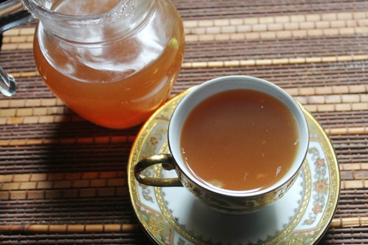 Mettete in un pentolino l’acqua, la buccia di mela, la cannella e i chiodi di garofano. Portate il liquido ad ebollizione per circa 5 minuti, coprendo con un coperchio. Lasciate riposare a fuoco spento per 10 minuti, filtrate e versate il tutto in due tazze. Dolcificate con un cucchiaino di miele o con zucchero di canna, secondo i vostri gusti.