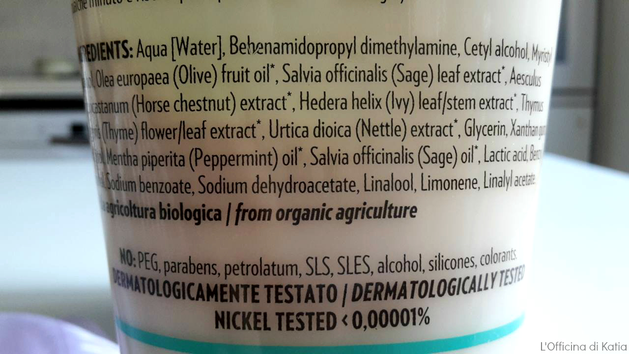 La consistenza di questa maschera è ottima, nè troppo liquida e nè troppo densa. La prima cosa che si nota è sicuramente l’intenso odore balsamico, non sempre amato a tutti, ma gradevole al mio olfatto. Avverto una piacevole sensazione respirando le fragranze di origine naturale, nulla a che vedere con quelle sintetiche presenti in numerosi prodotti commerciali. Dopo lo shampoo applico una noce di prodotto sulla mano, la stendo accuratamente sulle lunghezze e lascio in posa per qualche minuto. Riesce a nutrire in profondità i capelli, senza appesantire la cute. La sua buona azione è dovuta alla presenza del behenamidopropyl dimethylamine, un districante e condizionante ottenuto dall’acido grasso behenilico proveniente dalla lavorazione dell’olio di semi dell’albero Moringa oleifera, originario del subcontinente Indiano e dalla dimetilaminopropilamina. Inoltre grazie alla presenza di edera, ortica, salvia, ippocastano, menta e timo va a rinfrescare la cute lenendo da prurito e fastidi tipici di chi ha una cute molto sensibile. Sono soddisfatta di questo prodotto perchè districa in poco tempo i miei capelli e contrasta il crespo. I capelli risultano morbidi, maneggevoli, soffici e più luminosi.