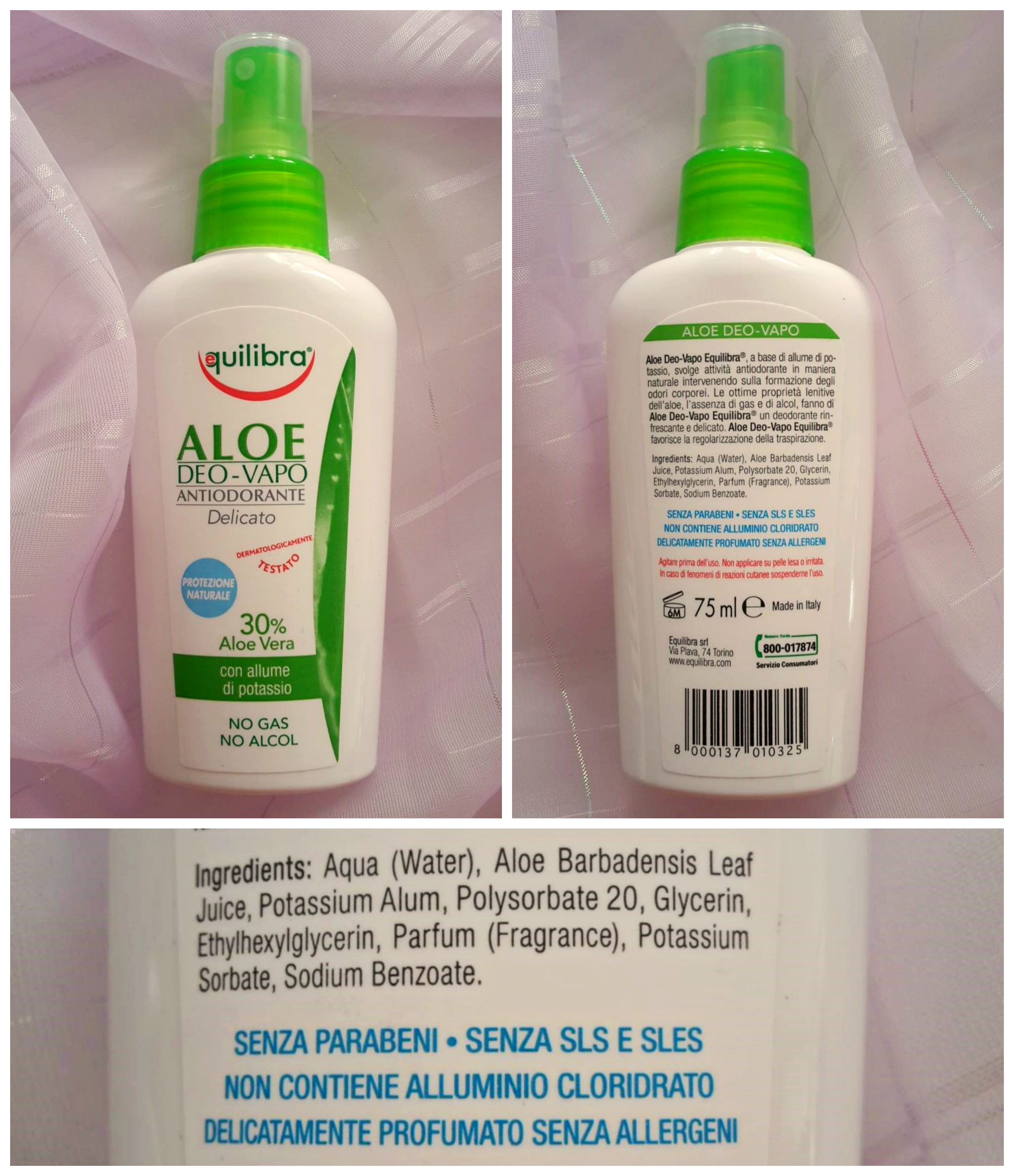 Come potete vedere dall’inci questo deodorante non è pieno di ingredienti malvagi e mi affascina quel 30% di aloe vera, avendo la pelle sensibile. Lo sto utilizzando da qualche giorno ed anche in particolari condizioni di stress, durante il mio via vai quotidiano, non ho riscontrato alcun tipo di problema. Ha un comodo applicatore a spruzzo, non cola ed una profumazione delicata e leggerissima. Premetto che ho una sudorazione normale e su di me fa bene il suo lavoro, lasciando la zona interessata asciutta. Il prezzo ed il fatto che sia abbastanza diffuso nei supermercati e nelle profumerie mi spinge a consigliarvene l’acquisto. Prestate attenzione perchè in giro ci sono deodoranti di questa stessa linea con un erogatore più scomodo da usare e che fa disperdere troppo prodotto. Nonostante l’Equilibra non mi entusiasmi sempre per via di alcuni prodotti con parecchi pallini rossi… mi ritengo soddisfatta. 🙂